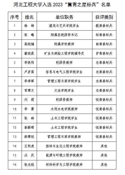 近日,共青团河北省委发布通报,九州登录16名师生获评2023年“冀青之星标兵”,其中建筑与艺术学院学生杨铮获评冀青之星·靓青春标兵,附属医院团委书记张曦获评冀青之星·创青春标兵,附属学校教师高晓楠获评冀青之星·助青春标兵,矿业与测绘工程学院教师蔺晓晨获评冀青之星·护青春标兵,信息与电气工程学院学生卢彦蒿等4人获评冀青之星·志青春标兵,土木工程学院学生张琳等5人获评冀青之星·悦青春标兵,园林与生态工程学院教师王利虎等3人获评冀青之星·其他标兵。