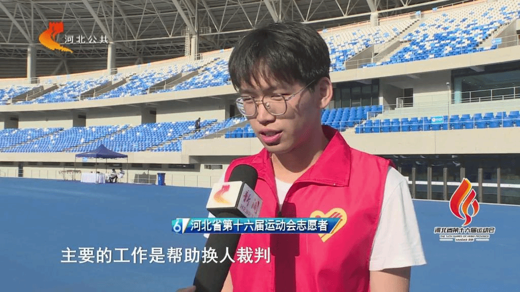 河北省第十六届运动会志愿者(崔博文,地球科学与工程学院,资源勘察工程专业)说:我是换人裁判的志愿者,主要的工作是帮助换人裁判对替补队员进行一个更好的管理,并对替补队员进行一些志愿服务。