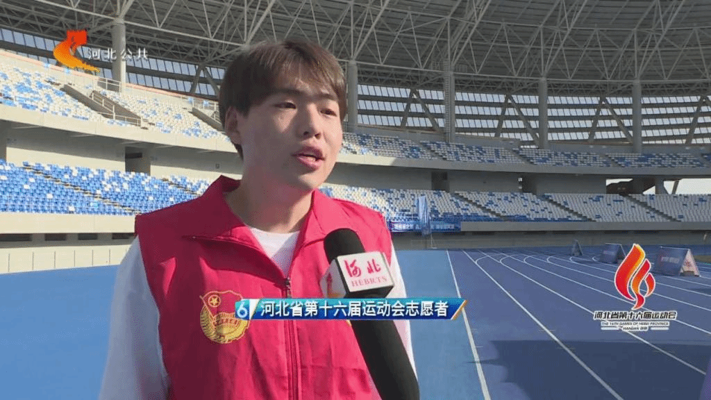 河北省第十六届运动会志愿者(刘培钦,数理科学与工程学院,数据科学与大数据技术专业)说:我是负责医疗站的救护,就是比如说有受伤伤员的话我就会上场,把他们用担架抬下来,这是我的工作。