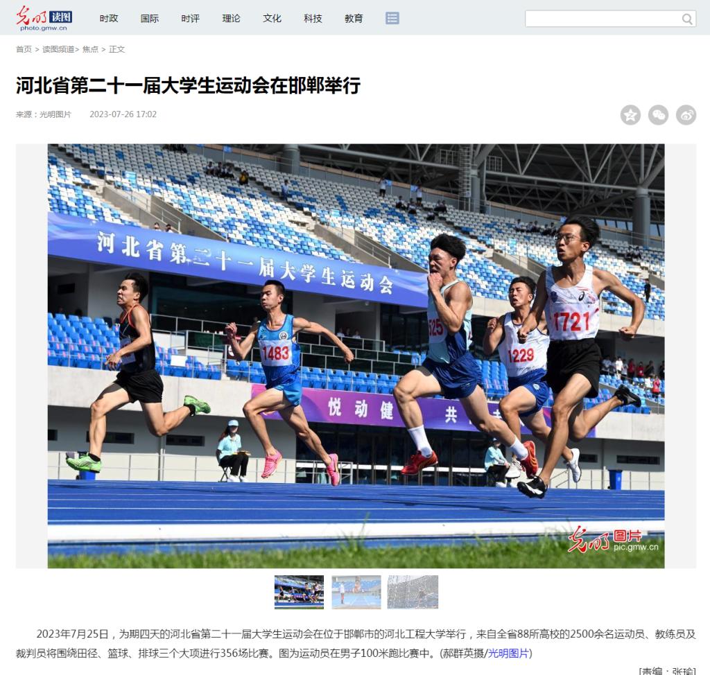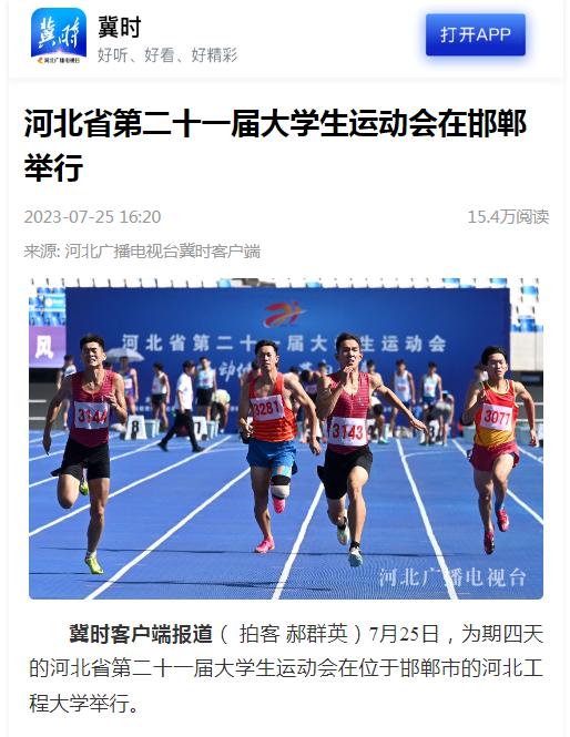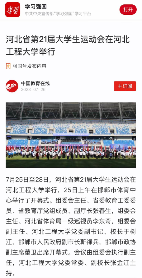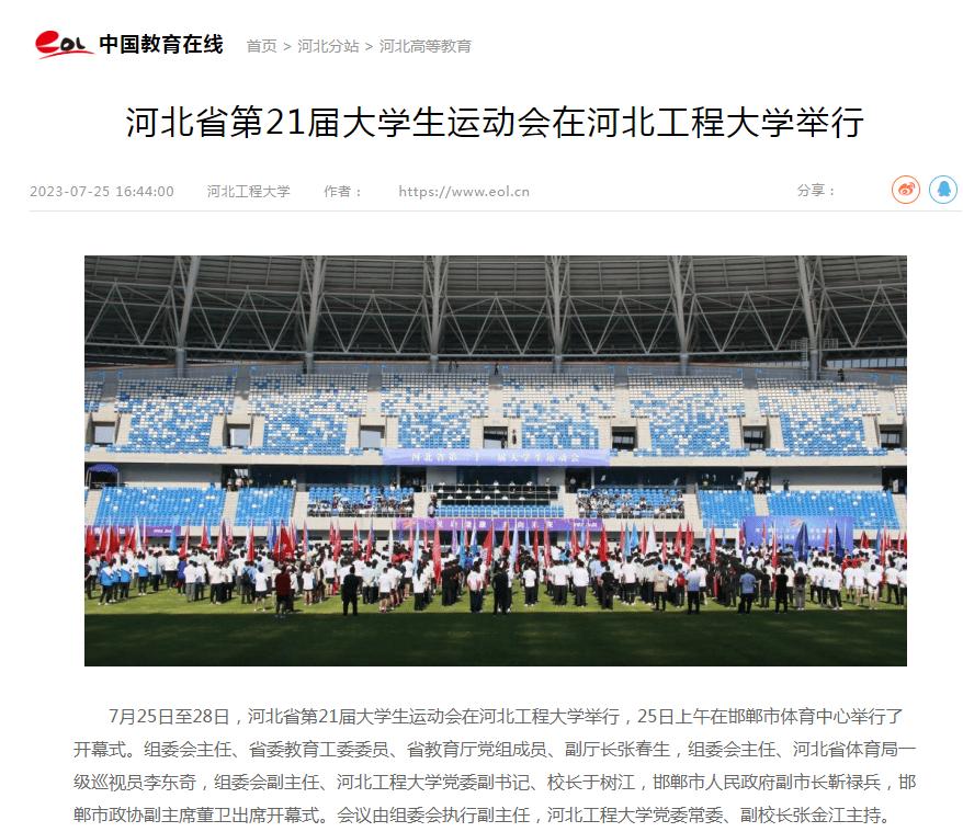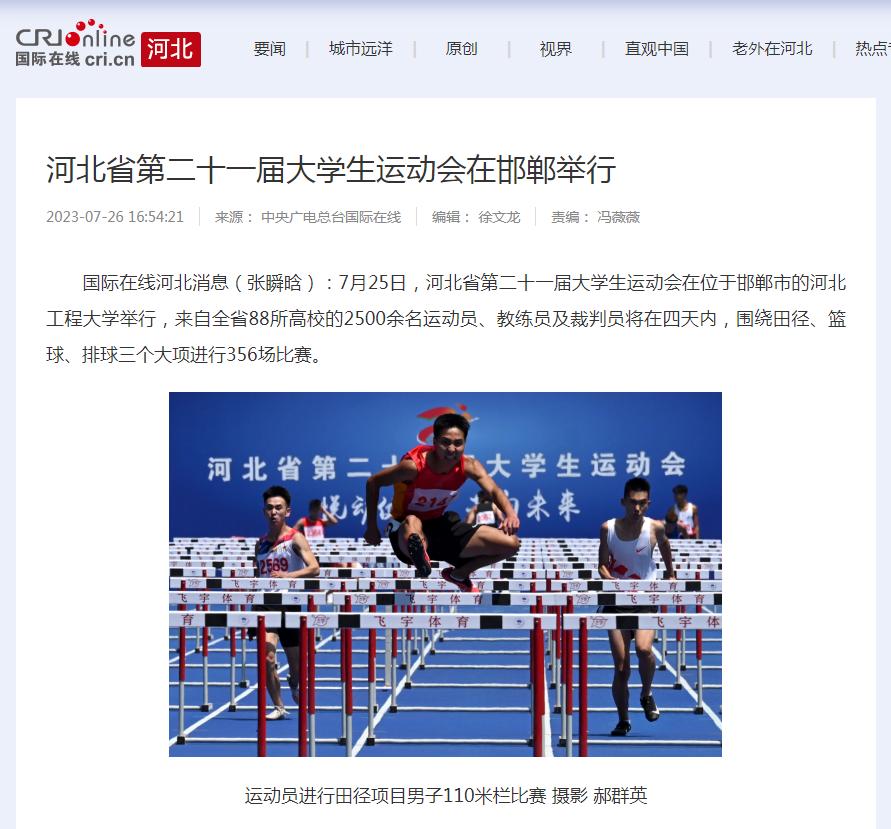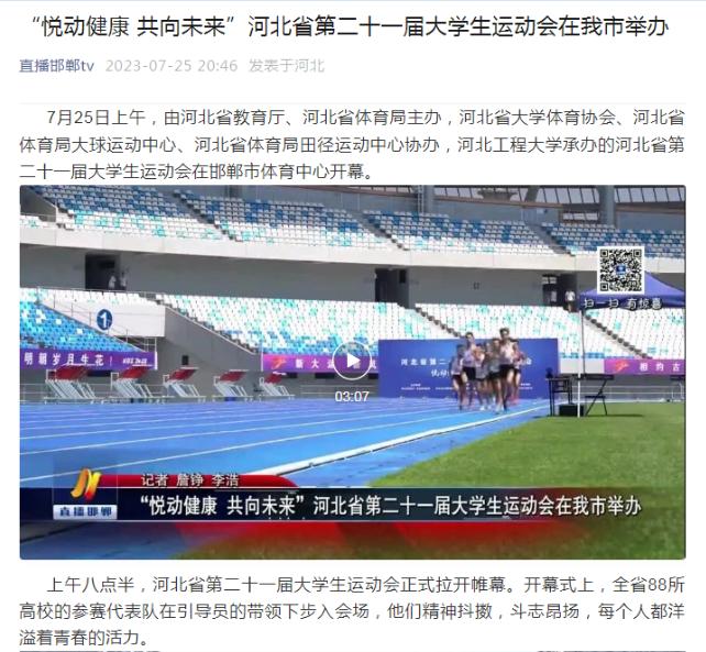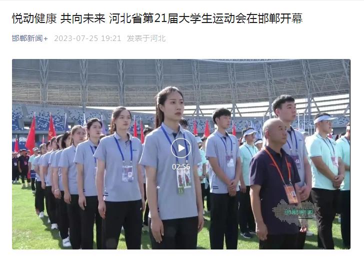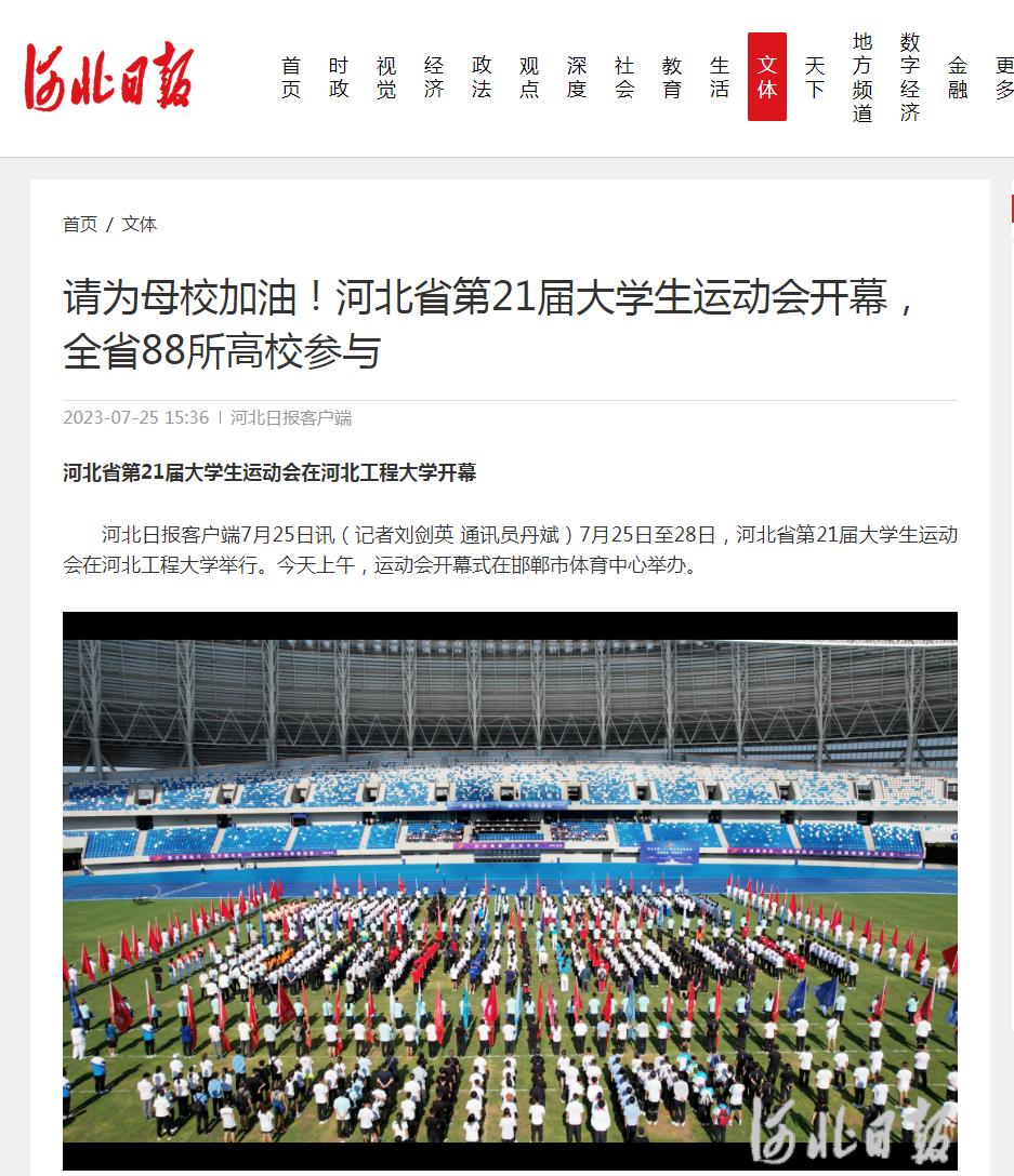 7月25日至28日,河北省第21届大学生运动会在河北工程大学举行,25日上午在邯郸市体育中心举行了开幕式。中央广电总台国际在线、光明网、学习强国学习平台、河北日报、河北广播电视台、河北新闻网、长城网、中国教育在线、邯郸日报、邯郸晚报、邯郸广播电视台等多家媒体报道了开幕式及比赛情况。