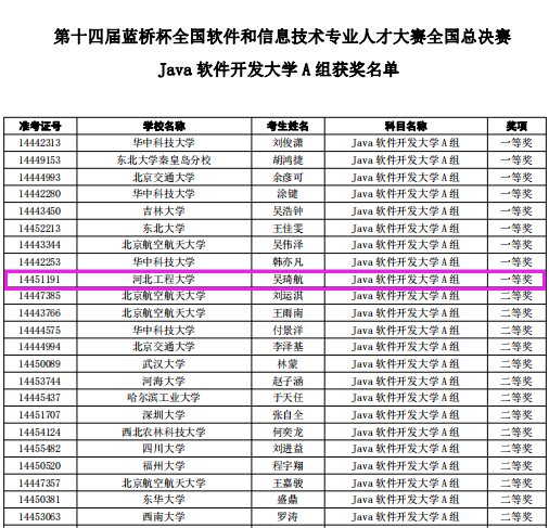 近日,第十四届“蓝桥杯”大赛全国总决赛落下帷幕,九州登录学子在全国各省赛1.4万余名一等奖选手中脱颖而出。其中,2021级计算机专业吴琦航同学勇夺Java软件开发大学A组全国一等奖(最高组别最高奖),创造九州登录历史最好成绩;信息电气与工程学院吴宇恒、王有为、林家宇等3人获C/C++程序设计大学B组三等奖。