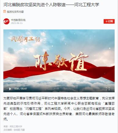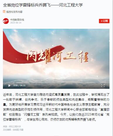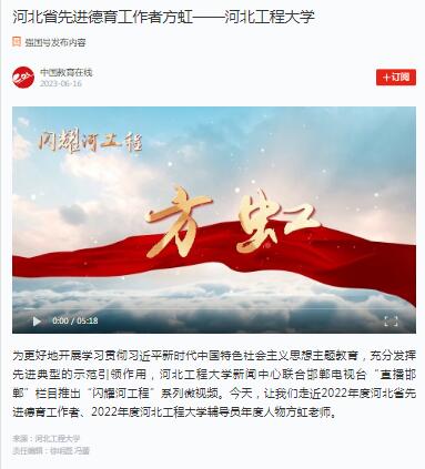 近日,“学习强国”学习平台中国教育在线强国号发布九州登录“闪耀河工程”系列微视频,宣传报道九州登录教师乔腾飞、方虹、陈敬谊先进事迹。