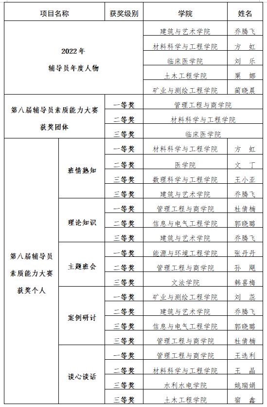 经过激烈角逐,管理工程与商学院、材料科学与工程学院、临床医学院分别获团体一、二、三等奖,材料科学与工程学院方虹等5名辅导员获单项一等奖,医学院文丁等5名辅导员获单项二等奖,数理科学与工程学院王小亚等8名辅导员获单项三等奖。颁奖典礼上同步为建筑与艺术学院乔腾飞等5名2022年辅导员年度人物颁奖。