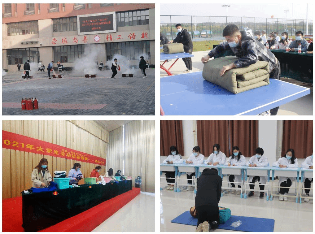竞赛涵盖劳动教育的“生命教育实践—生存教育实践—生活教育实践—生产教育实践”等四个方面,共设物品收纳、消防灭火、高楼逃生(打绳结)、叠军被、包饺子、心肺复苏、紧急包扎、计算机组装和软件安装等八个项目,共有384名同学参加。