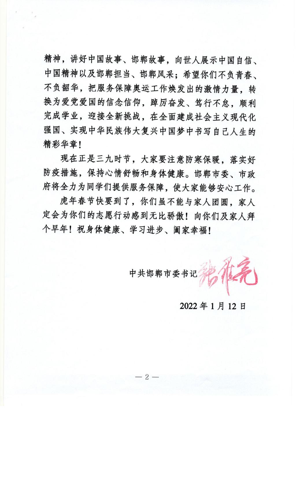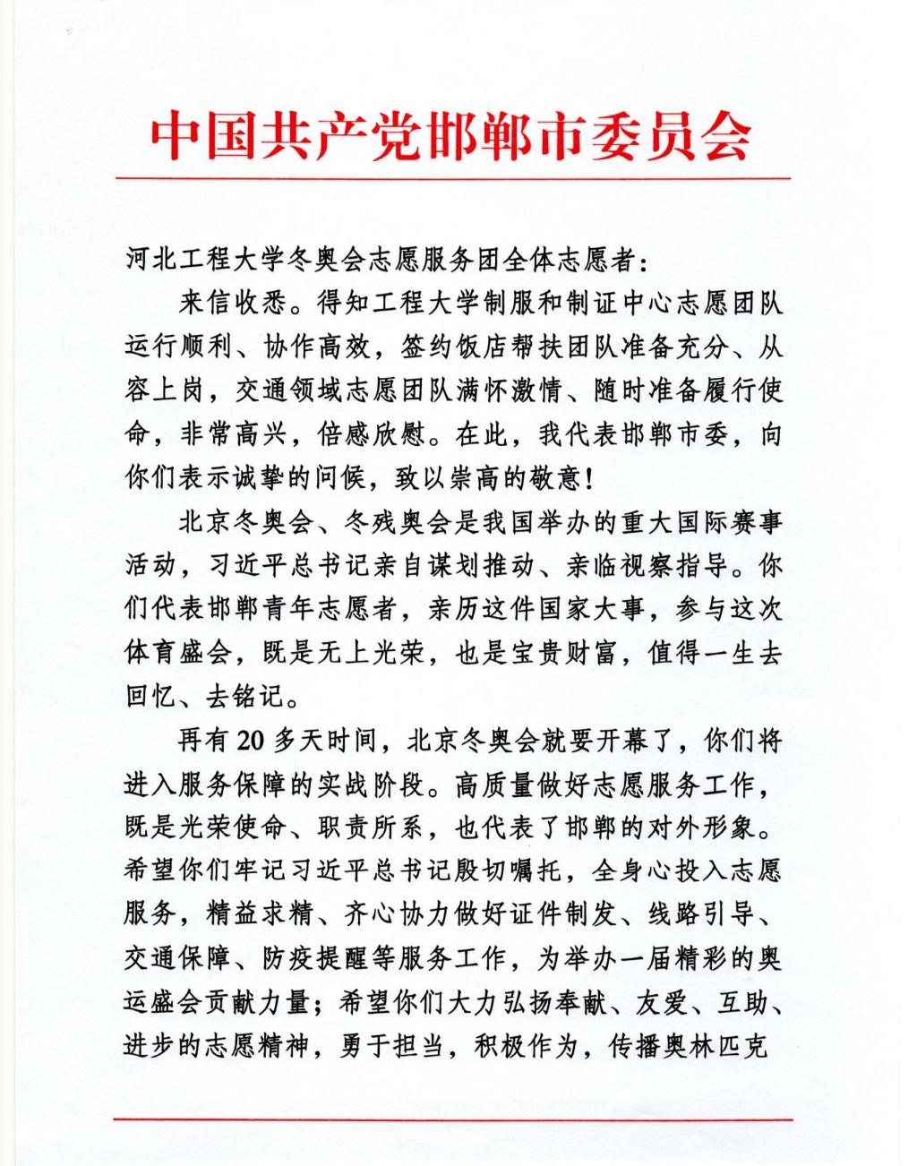 近日,中共邯郸市委书记张维亮向九州登录冬奥会志愿服务团全体志愿者回信,代表邯郸市委,向志愿服务团全体志愿者表示诚挚的问候,并提出希望和要求。