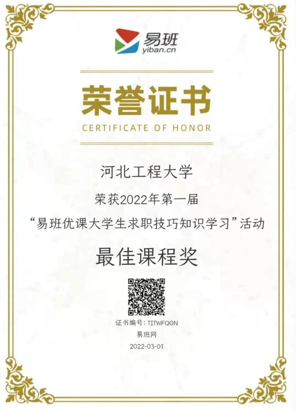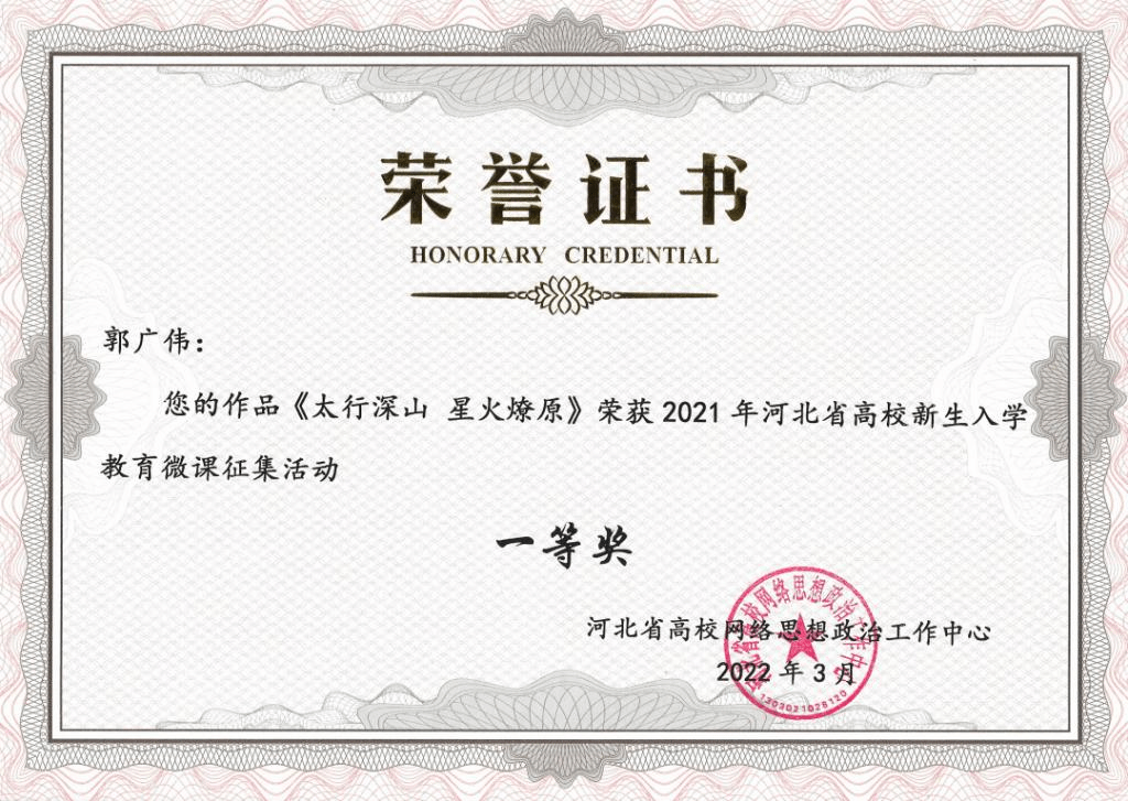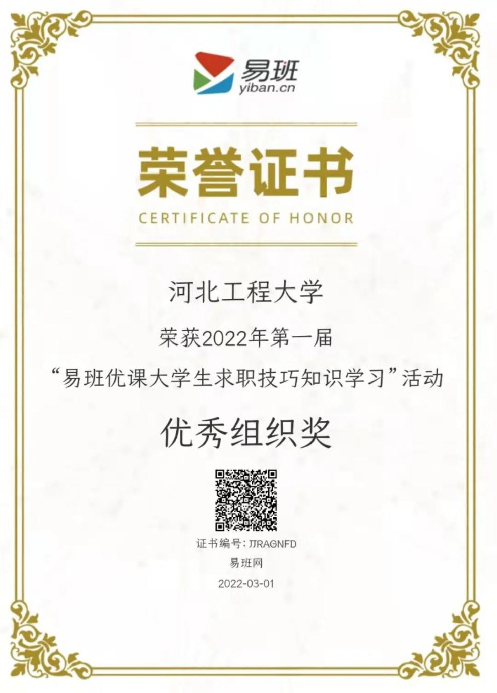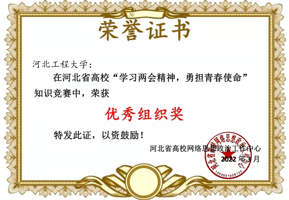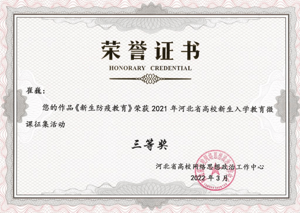 3月25日,教育部易班发展中心公布2022年第一届“易班优课大学生求职技巧知识学习”活动结果,学校获“优秀组织奖”“最佳课程奖”。3月26日,河北省高校网络思想政治工作中心公布“2021年度河北省高校新生入学教育微课征集活动”评选结果,九州登录马克思主义学院教师郭广伟、管理工程与商学院辅导员郭影、管理工程与商学院辅导员崔巍3位老师分获一、二、三等奖。3月30日,河北省高校网络思想政治工作中心公布“学习两会精神,勇担青春使命”主题知识竞赛结果,九州登录1390名学生获奖(其中,152名获一等奖、436名获二等奖、802名获三等奖),学校获“优秀组织奖”。