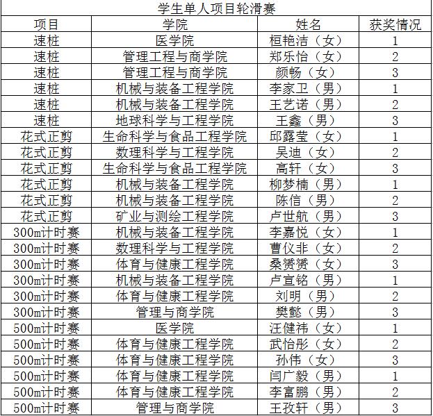 经过激烈角逐,材料科学与工程学院、医学院、能源与环境工程学院代表队分获学生团体项目“冲锋团队”比赛前三名,水利水电学院、机械与装备工程学院、土木工程学院代表队分获学生团体项目“不倒森林”比赛前三名,数理科学与工程学院、矿业与测绘工程学院、生命科学与食品工程学院代表队分获学生团体项目“夹球跑接力”比赛前三名,水利水电学院、文法学院、生命科学与食品工程学院代表队分获学生团体项目“趣味定点投篮”比赛前三名。学生单人项目轮滑比赛中来自10个学院的24名运动员分别取得了优异成绩。
