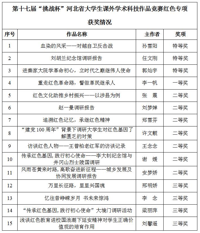 近日,2021年“挑战杯”河北省大学生课外学术科技作品竞赛组委会公布了红色专项活动评审结果,九州登录获特等奖3项,一等奖1项,二等奖7项,三等奖4项。