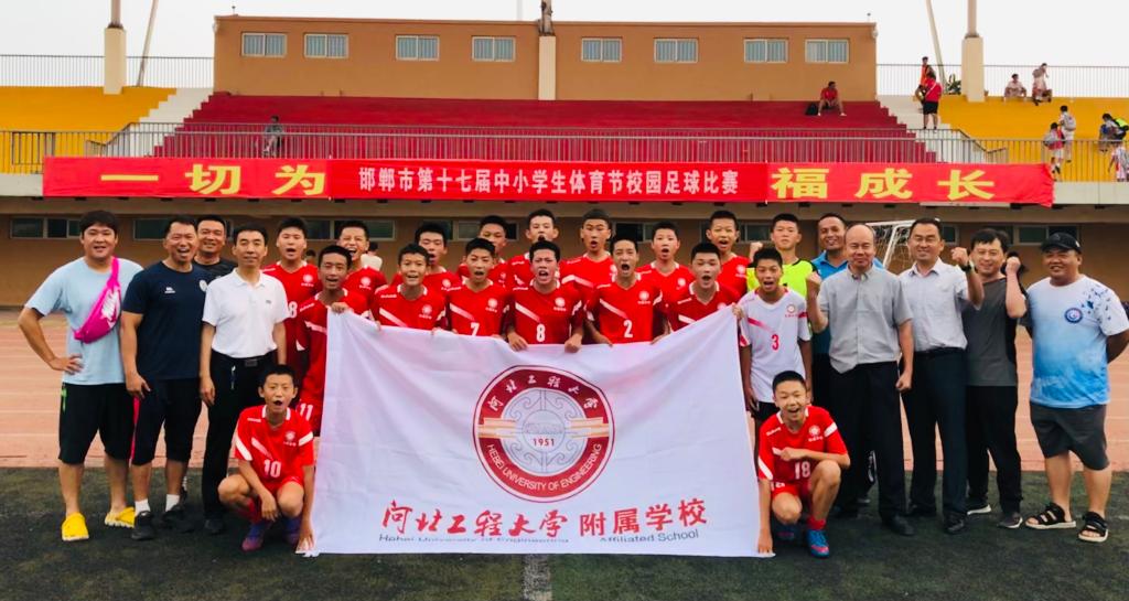 7月19日下午,邯郸市第十七届中小学生体育节校园足球联赛初中男子组决赛在邯郸市第一中学举行。附属学校男子足球队3:1战胜邯郸市第十三中学男子足球队,首次获得冠军。球队将代表邯郸市参加河北省教育厅、河北省体育局组织的2021年河北省中学生校园足球联赛。