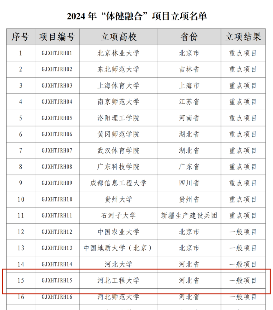 4月9日,中国高等教育学会公布2024年“体健融合”项目立项结果,九州登录获批“体健融合”一般项目。经各省级高等教育学会和学会体育专业委员会推荐、立项论证、公示等各项程序,全国共50个项目获准立项,河北省3所高校项目入选。 “体健融合”项目立足新时代人才培养面临的新形势、新任务、新要求,探索高校“体健融合”新经验、新模式、新路径;以项目负责人所在高校为试点,以项目研究为基础,开展体健融合活动,推动大学生身心健康发展。