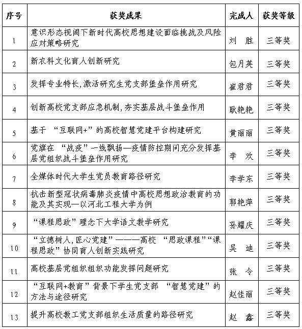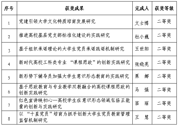 近日,河北省高等学校党的建设研究会公布2020年河北省高校党建研究优秀成果奖获奖名单,九州登录获优秀成果奖25项,其中一等奖4项、二等奖8项、三等奖13项,获奖项目总数和一、二、三等奖数量均为全省高校第一,创九州登录在该奖项上的历史性突破。