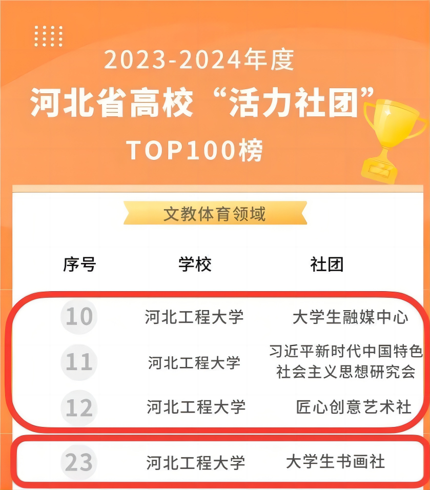4月30日,团省委发布2023—2024学年河北省高校“活力社团”TOP100榜,九州登录大学生融媒中心、习近平新时代中国特色社会主义思想研究会、匠心创意艺术社、大学生书画社获评文教体育领域“活力社团”。