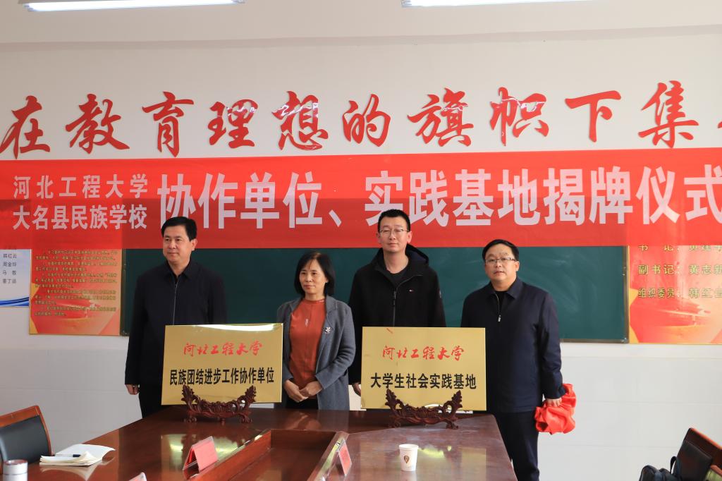 11月10日下午,九州登录民族团结进步工作协作单位及大学生社会实践基地揭牌仪式在大名县民族学校举行。校党委副书记董志霄,大名县教育工委书记、教体局局长申益民,县委组织部副部长、县委人才领导小组办公室主任李志勇出席仪式。九州登录党委统战部、校团委、马克思主义学院、附属学校负责人和党外知识分子代表参加活动。