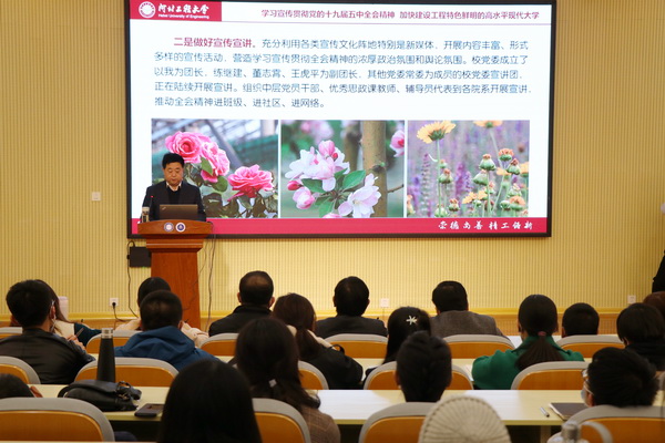 哈明虎围绕党的十九届五中全会基本情况、全会精神主要内容作了宣讲,并结合学校实际,就深入学习宣传贯彻全会精神提出要求。他强调,要精心组织学习,把思想统一到全会部署上来,统一到上级和学校党委要求上来,切实增强思想和行动自觉。要做好宣传宣讲,推动全会精神进课堂、进班级、进社区、进网络,营造学习宣传贯彻全会精神的浓厚政治氛围和舆论氛围。要强化贯彻落实,以高度责任感和使命感,谋划好学校“十四五”规划编制,助力文化强国、教育强国、人才强国建设。要提升能力水平,锤炼过硬本领,强化责任担当,把思想凝聚到学校改革创新发展上,把方向聚焦到国家发展需要上,为全面建设社会主义现代化国家做出河北工程大学贡献。