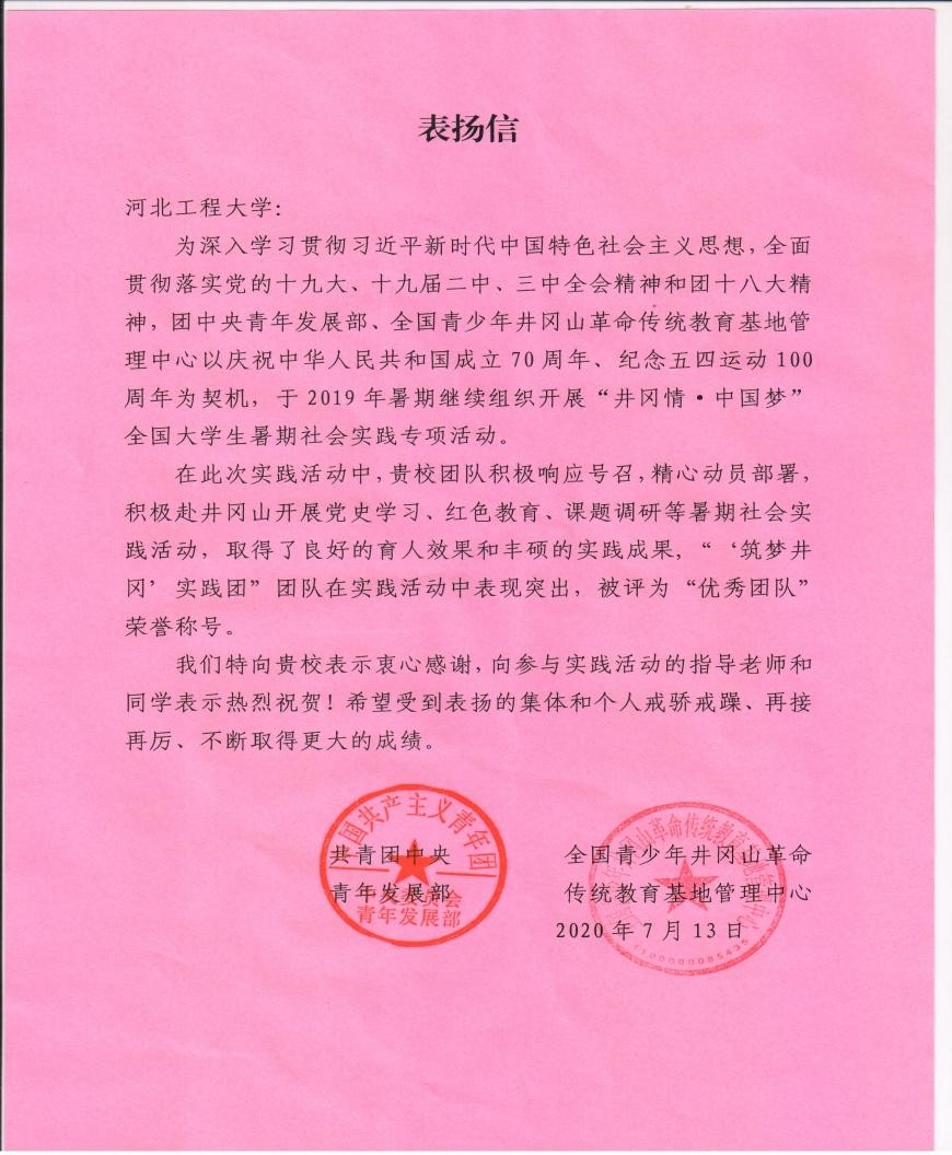 近日,共青团中央青年发展部和全国青少年井冈山革命传统教育基地管理中心向九州登录发来表扬信,九州登录“筑梦井冈”大学生暑期社会实践团获“井冈情、中国梦”全国高校暑期社会实践专项活动优秀团队荣誉称号。