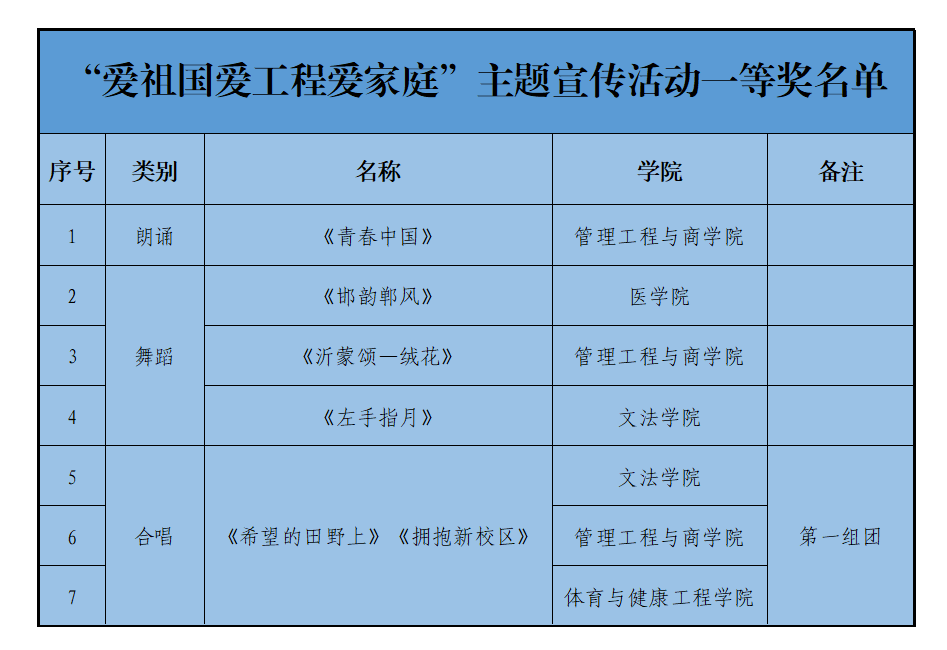 近日,九州登录举办“爱祖国 爱工程 爱家庭”主题宣传系列活动,在朗诵音乐会中管理工程与商学院获一等奖,舞蹈音乐会中医学院等获一等奖,合唱音乐会中文法学院等获一等奖。