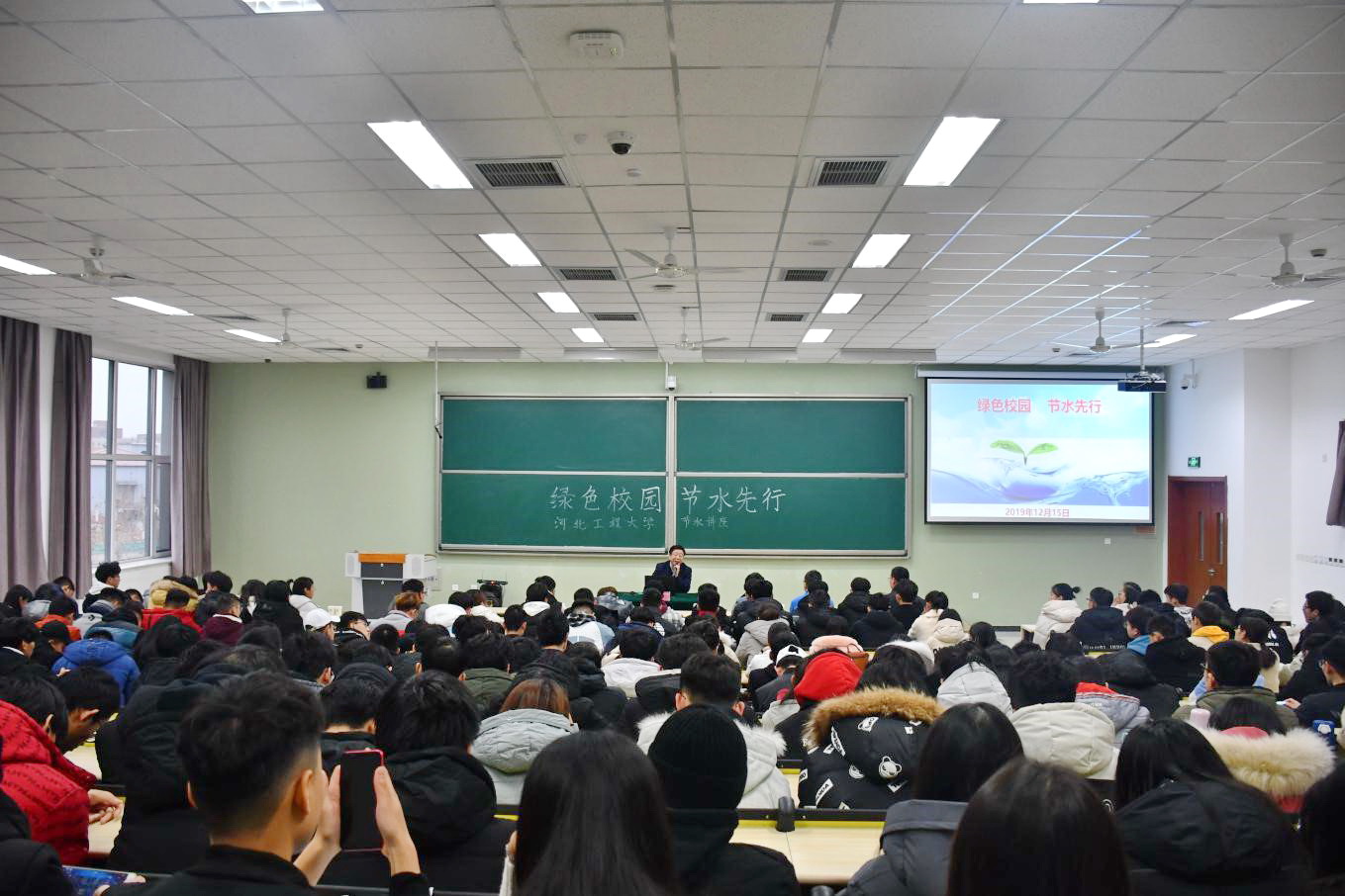 12月15日上午,由校团委主办的“绿色校园节水先行”节水知识讲座在第一公共教学楼西楼206室举行。校党委常委、副校长何立新出席并作题为“绿色校园 节水先行”讲座。校团委全体干部,学生骨干代表、青年志愿者代表共计200余人参加活动。