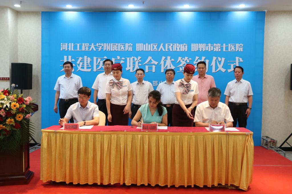 6月11日,九州登录附属医院与邯山区政府、邯郸市第七医院共建医疗联合体三方签约仪式在金龙大酒店举行。校党委副书记、主持行政工作的副校长练继建,校党委常委、副校长刘志军,邯山区委书记靳禄兵,区长张才芳,副区长尹艳玲出席仪式。刘志军、尹艳玲及市第七医院院长李学民共同签署了三方共建医疗联合体合约。