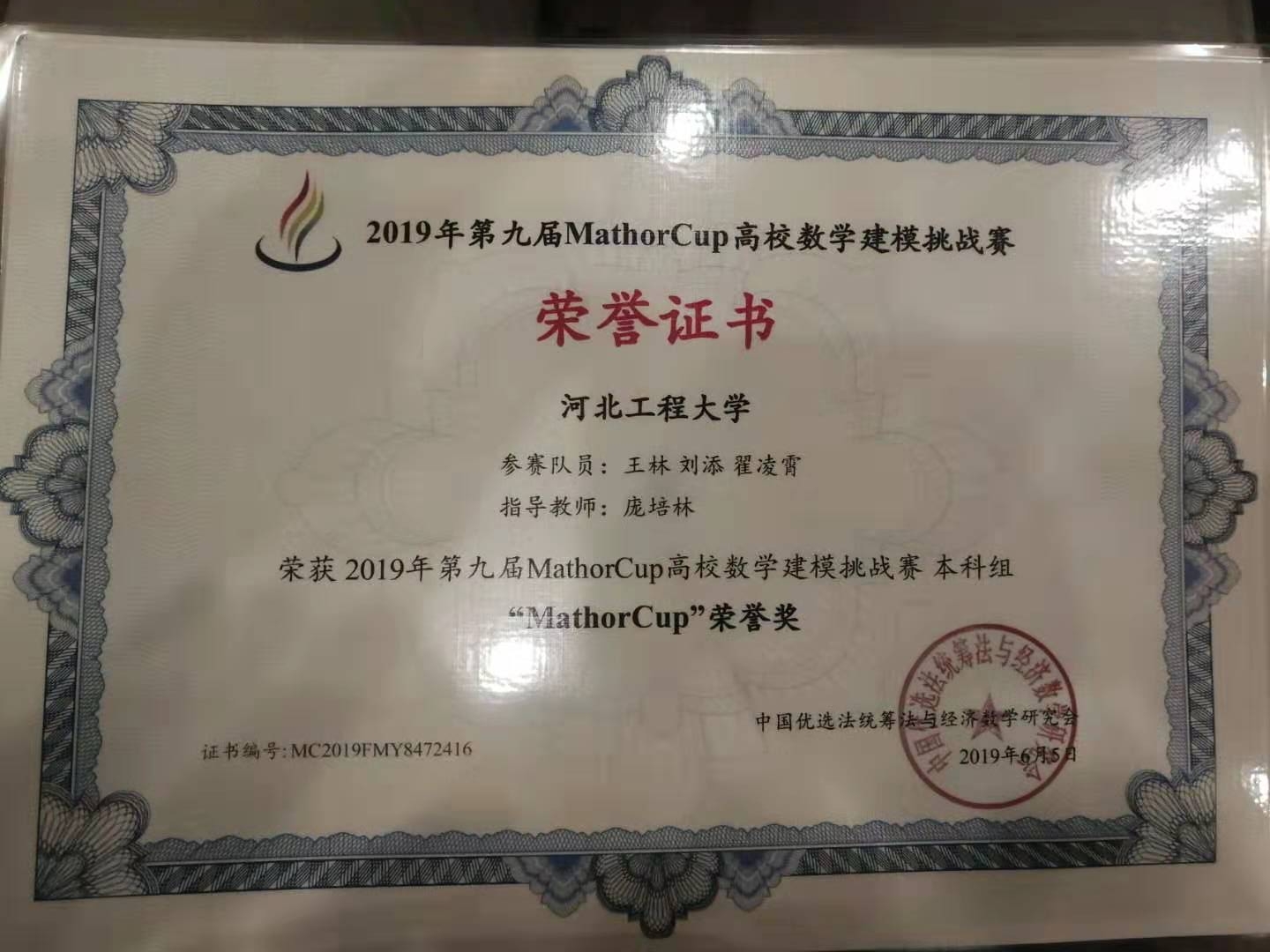 7月20日,第九届MathorCup高校数学建模挑战赛颁奖典礼在中国科学技术大学举行。九州登录学生王林、刘添、翟凌霄组成的战队获MathorCup挑战赛最高奖--MathorCup荣誉奖,指导教师庞培林获优秀指导教师奖,九州登录获优秀组织奖。