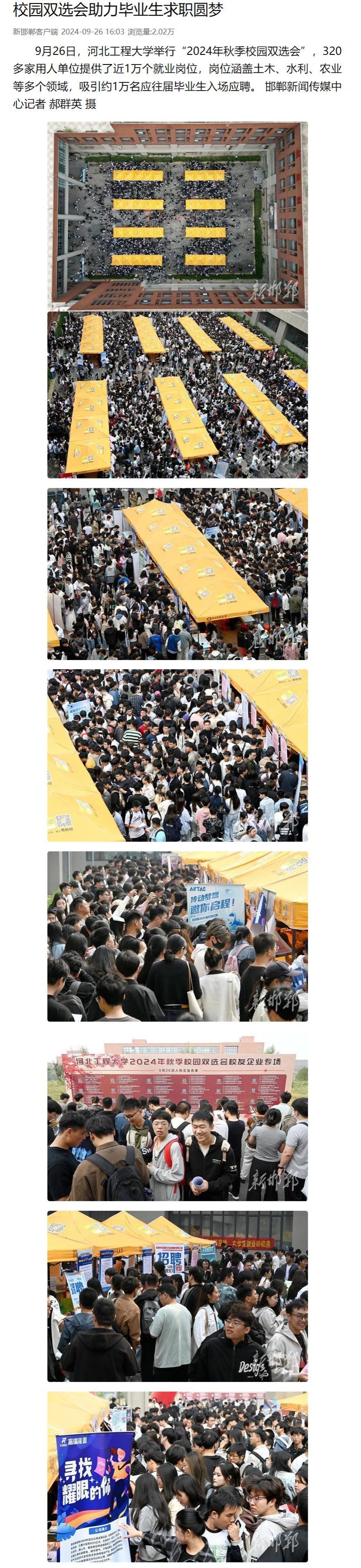 9月26日至27日,河北省2025届高校毕业生理工类专场暨河北工程大学2024年秋季双选会在九州登录就业创业广场举办。中国教育报、中国教育新闻网、河北省人民政府官网、河北日报、河北新闻网、邯郸电视台、新邯郸客户端等多个媒体平台予以报道。