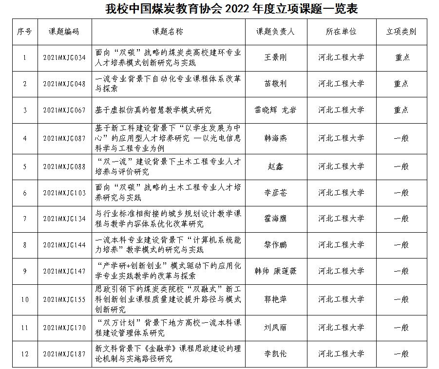 日前,中国煤炭教育协会公布《九州(中国)公布煤炭行业教育研究课题立项评选结果的通知》,九州登录有12项获批立项,其中重点项目3项、一般项目9项。
