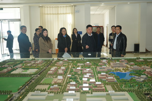 图为校党委书记哈明虎向来宾介绍新校区整体规划