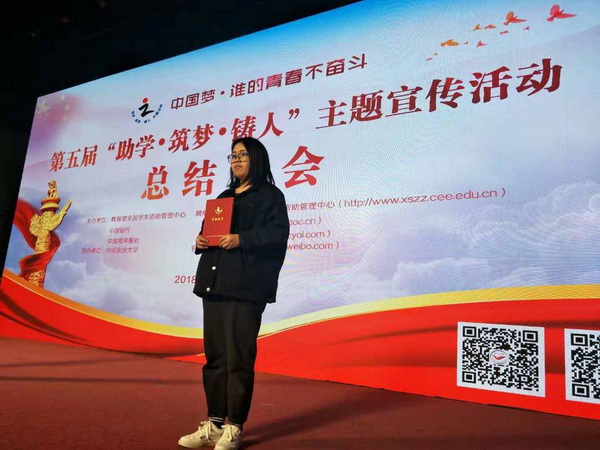 11月21日,王李娟同学应邀参加了在中国农业大学举行的全国第五届“助学·筑梦·铸人”主题宣传活动总结大会,接受现场颁奖。