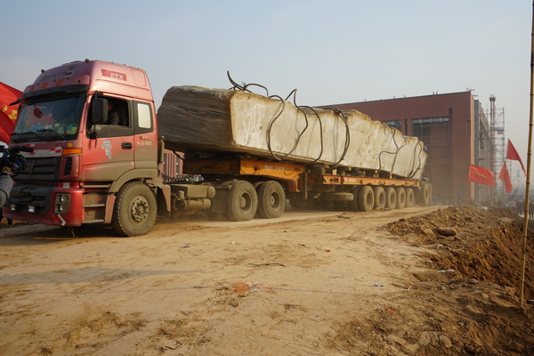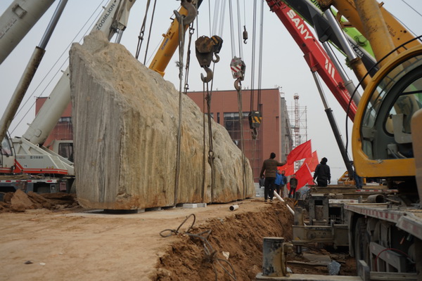 | 图为泰山石搬运至新校区南大门内指定位置 |