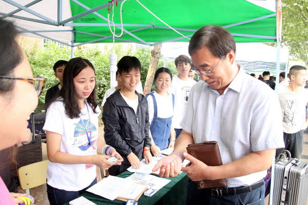 吕海涛一行看望了现场工作人员和师生志愿者,与新生及家长亲切交流,深入了解了新生报到率、入学手续办理情况,并就迎新工作相关具体问题进行了协调解决。