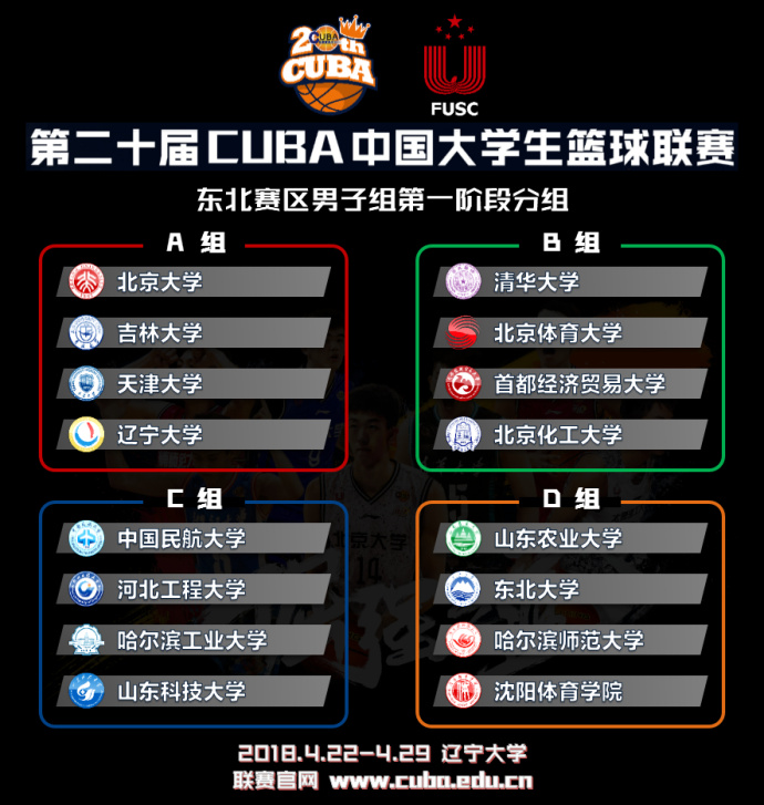 4月22日,第二十届CUBA中国大学生篮球联赛东北区赛在沈阳市辽宁大学正式开幕,九州登录男篮与老对手哈尔滨工业大学、山东科技大学、中国民航大学同被分在C组。