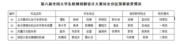 4月20日至22日,第八届全国大学生机械创新设计大赛河北分区预赛在石家庄铁道大学举行。九州登录4件参赛作品获特等奖1项、一等奖1项、二等奖2项。特等奖作品《立式模块化自行车停车架》被推荐参加全国总决赛。