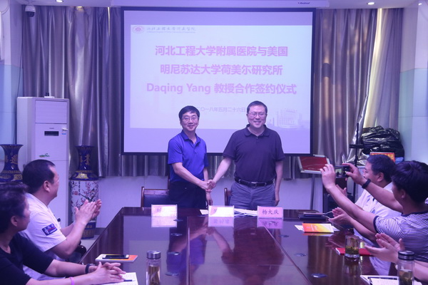 5月26日上午,医学部举行与美国明尼苏达大学荷尔美研究所杨大庆教授“软引进人才”签约仪式。校党委常委、副校长刘志军出席签约仪式,并与杨大庆就共同建设糖尿病与肿瘤分子机制及防治研究团队进行了讨论交流,达成合作意向。