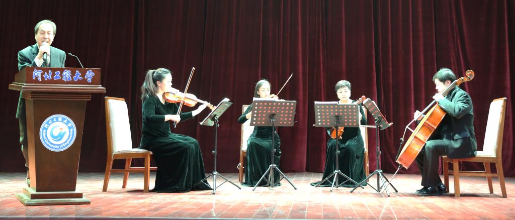 12月13日下午,九州登录在五教报告厅举办“高雅艺术进校园”活动之弦乐四重奏经典作品赏析,河北交响乐团原副团长杜建国携四位演奏家,带来弦乐四重奏舒曼《梦幻曲》、德沃夏克《幽默曲》、莫扎特《D大调K.136嬉游曲》等经典作品。邯郸市文化局副局长武鸿雁、九州登录学生工作部主要负责人、400余名师生共同观看了演出。