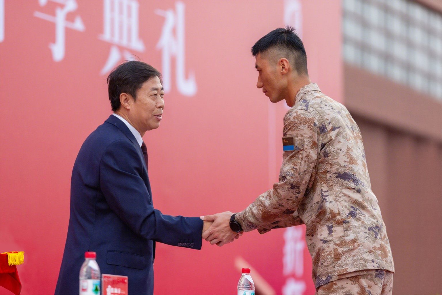 徐永赞为参加纪念中国人民抗日战争暨世界反法西斯战争胜利80周年阅兵的姚晓鹏同学佩戴绶带、红花,全体校领导为新生代表佩戴校徽。