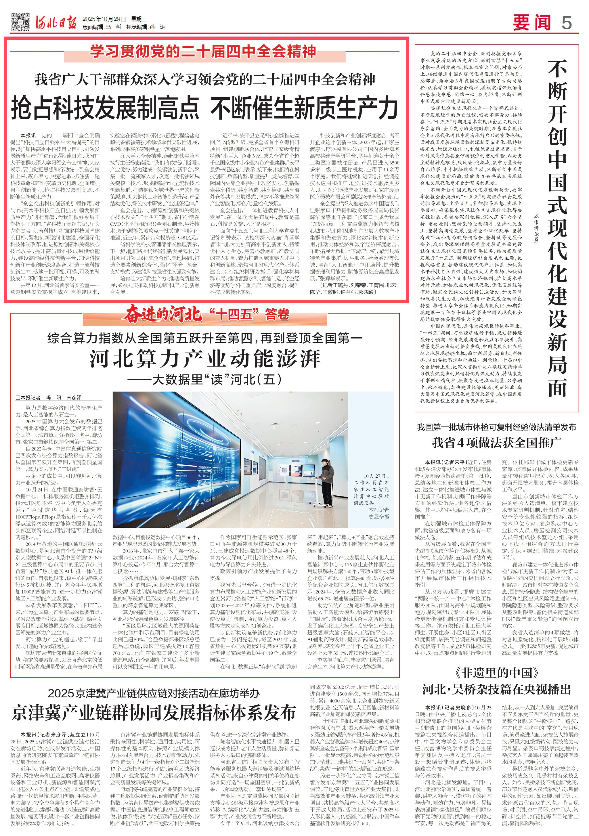 10月29日,《河北日报》刊发题为《我省广大干部群众深入学习领会党的二十届四中全会精神,抢占科技发展制高点,不断催生新质生产力》的报道。报道提到,“全会提出,‘一体推进教育科技人才发展’。在一体化发展布局中,教育是基石,科技是关键,人才是根本。面向‘十五五’,河北工程大学党委书记徐永赞表示,该校将深入实施‘青蓝学者’计划,大力引育高水平创新团队,持续优化人才生态,完善科教融汇、产教协同的育人机制,着力打造区域重要人才中心和创新高地。聚焦河北省现代化产业体系建设,以有组织科研为抓手,强化学科集群布局,推动智慧水利、智能制造、低空经济等优势学科与重点产业深度融合,提升科技成果转化实效。”